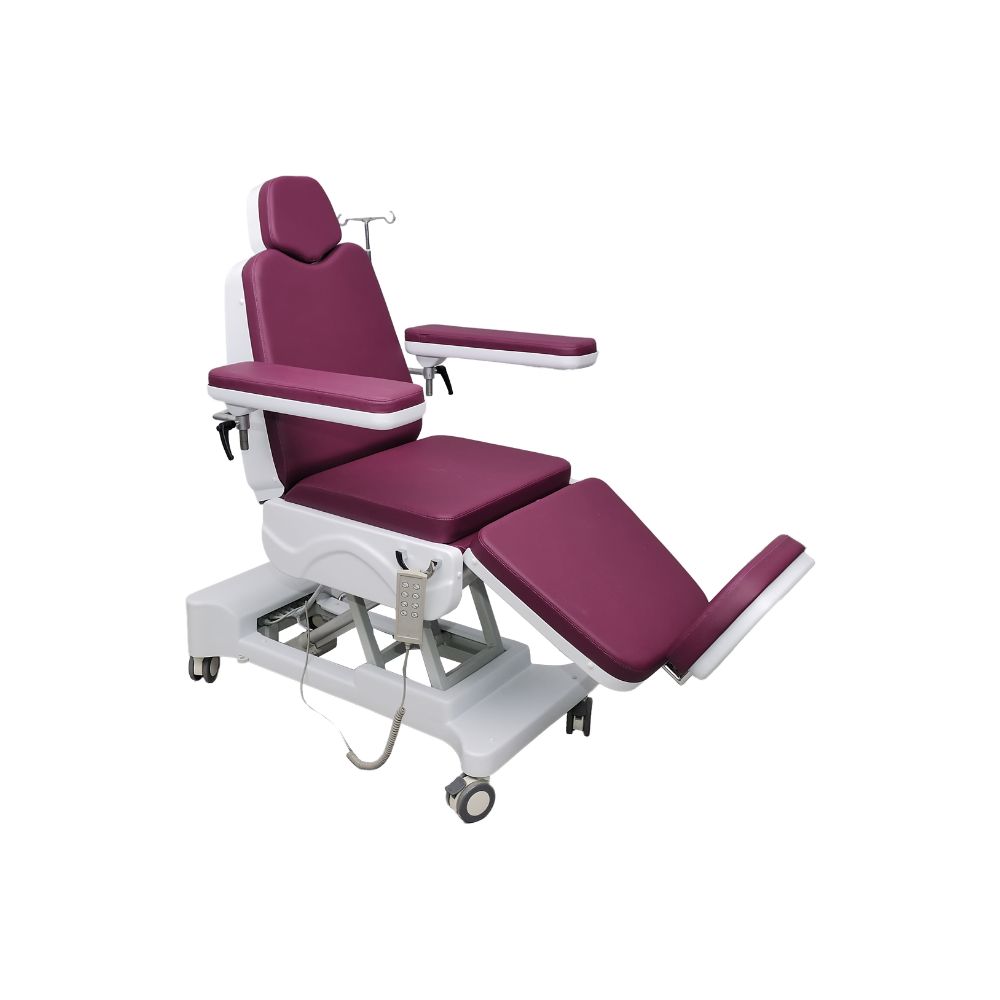 The chair is equipped with Trendelenburg and up-and-down movements, making it suitable for various medical needs. The foot section includes a cramp support part that adjusts to the patient’s leg length, while wheels with brakes ensure the chair can be moved easily and securely fixed in place, supporting safe and efficient use.